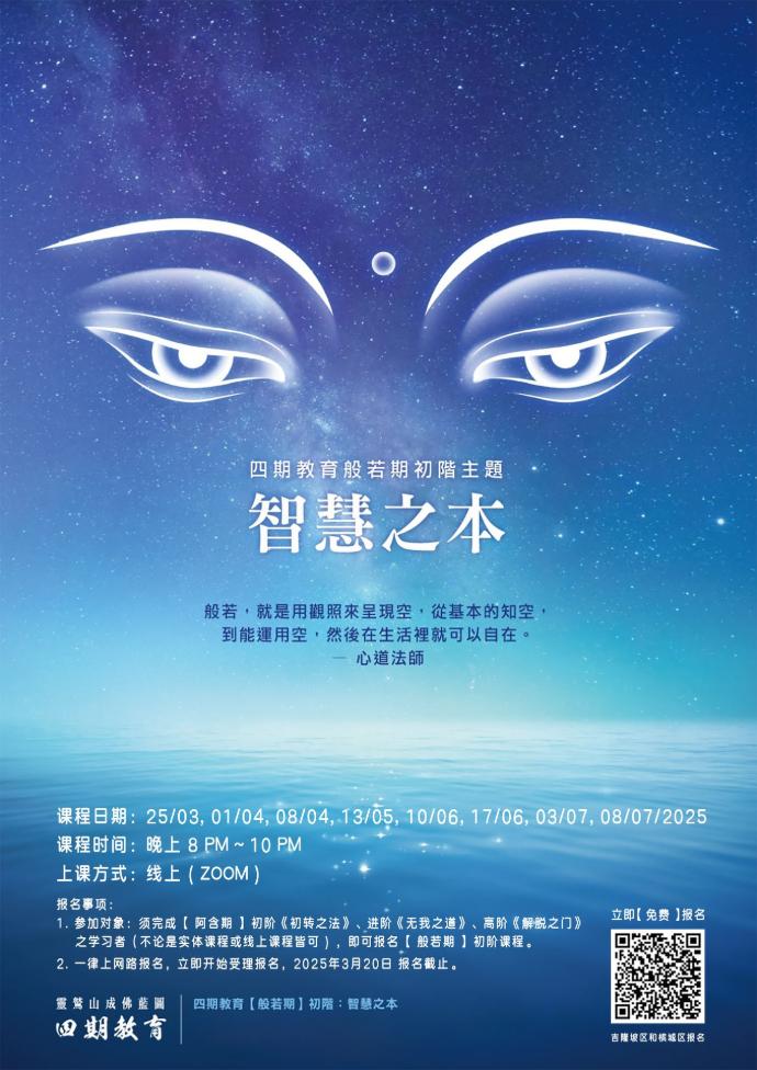 1. 参加对象:须完成【 阿含期 】初阶《初转之法》、进阶《無我之道》、高阶《解脫之門》之学习者(不论是实体课程或线上课程皆可 ) ,即可报名【 般若期 】初阶课程。