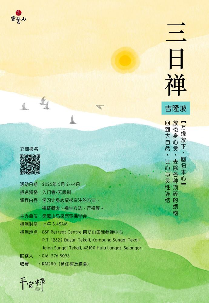 课程内容:学习让身心放松专注的方法 - 禅修概念、禅坐姿势、禅坐方法、行禅等。