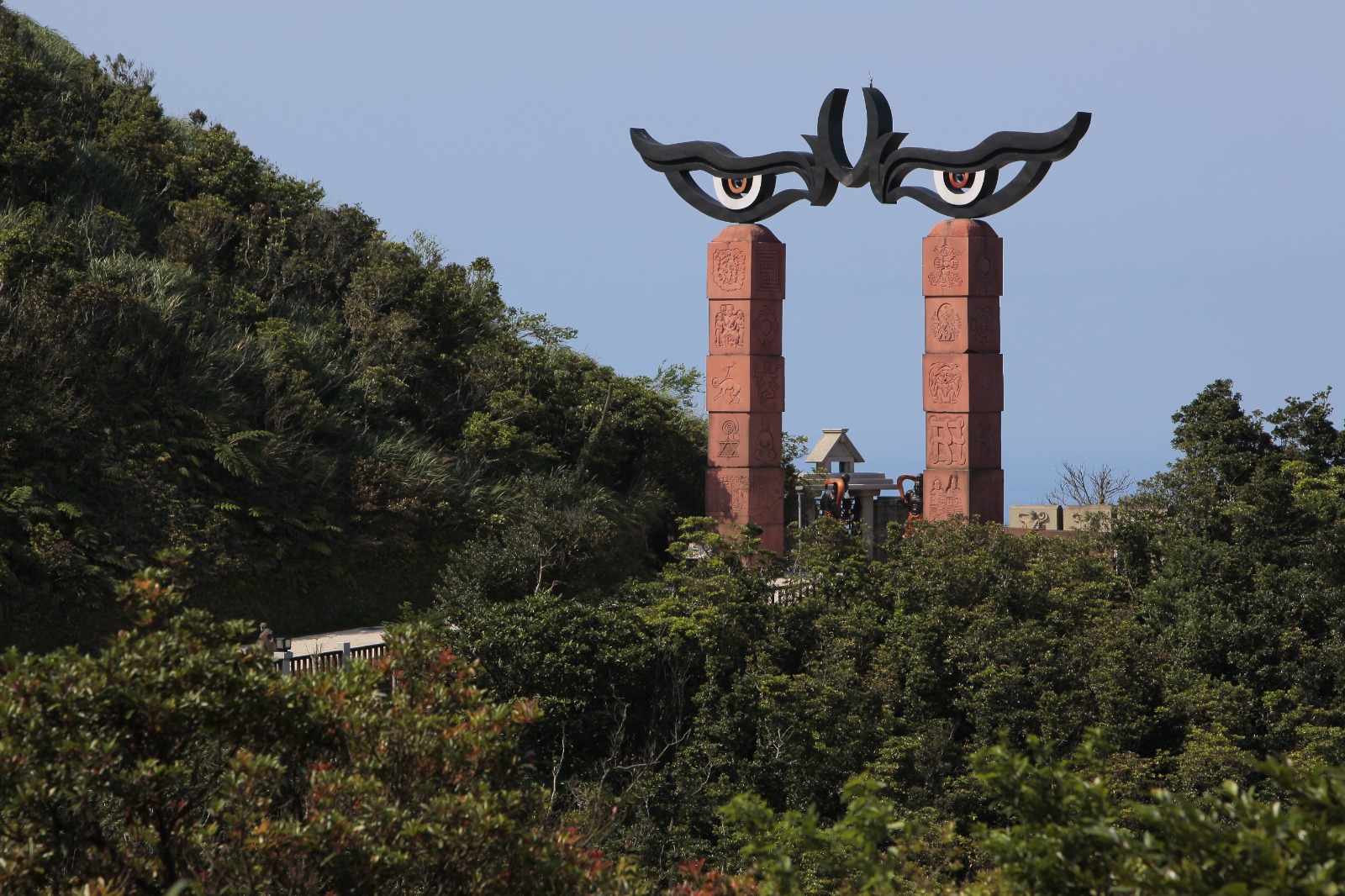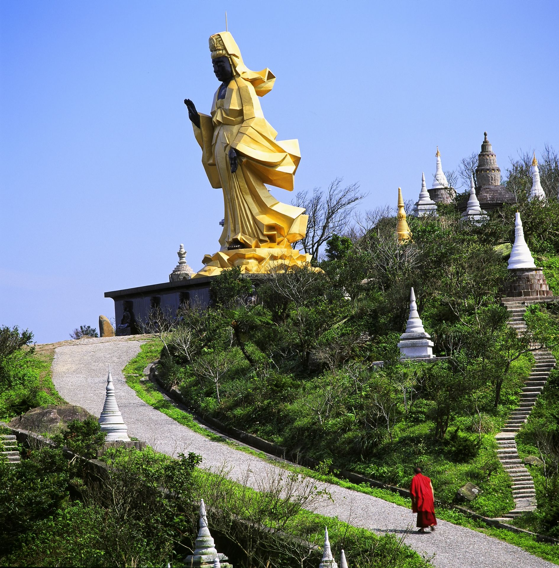 沿着到场朝山步道,尽头即为开山缘起的洞窟,为当年心道法师断食闭关的「法华洞窟」。一路走去,尽见红瓦石屋、山间林道的石板路、错落安置着青斗石雕的五百罗汉、石砌舍利塔林、来自斯里兰卡的第三代「摩诃菩提圣树」,以及缅甸白玉石佛像等。诸种象征修行成就的圣迹圣物安奉在自然和谐、纯朴宁静的山海之巅,展现新时代的禅风。